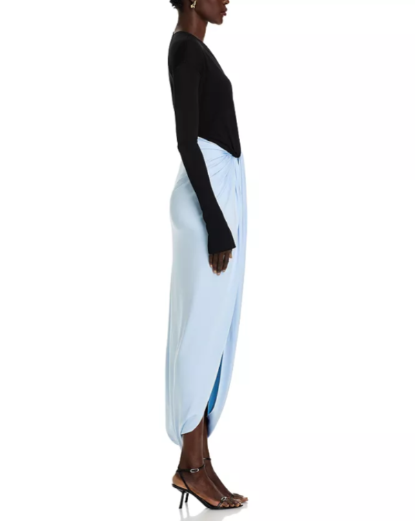 Deep-V neck Long sleeves, asymmetric shoulder seams, cuff splits Knot detail, two-tone color, stretch jersey fabrication Gown silhouette Side zip closure Thigh-high front drape Fitted through the waist and sleeve Viscose; contrast: viscose/elastane Dry clean Imported