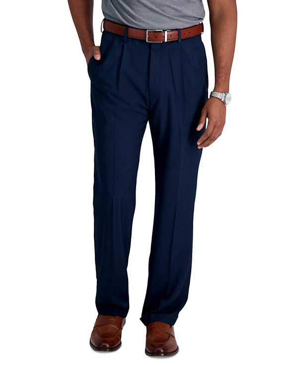 Distinguish your office or weekend look with the classic style exuded by a pleated front and cuffs on these Haggar dress pants. Four-way stretch fabric and an expandable waistband provide exceptional comfort that matches their great look.