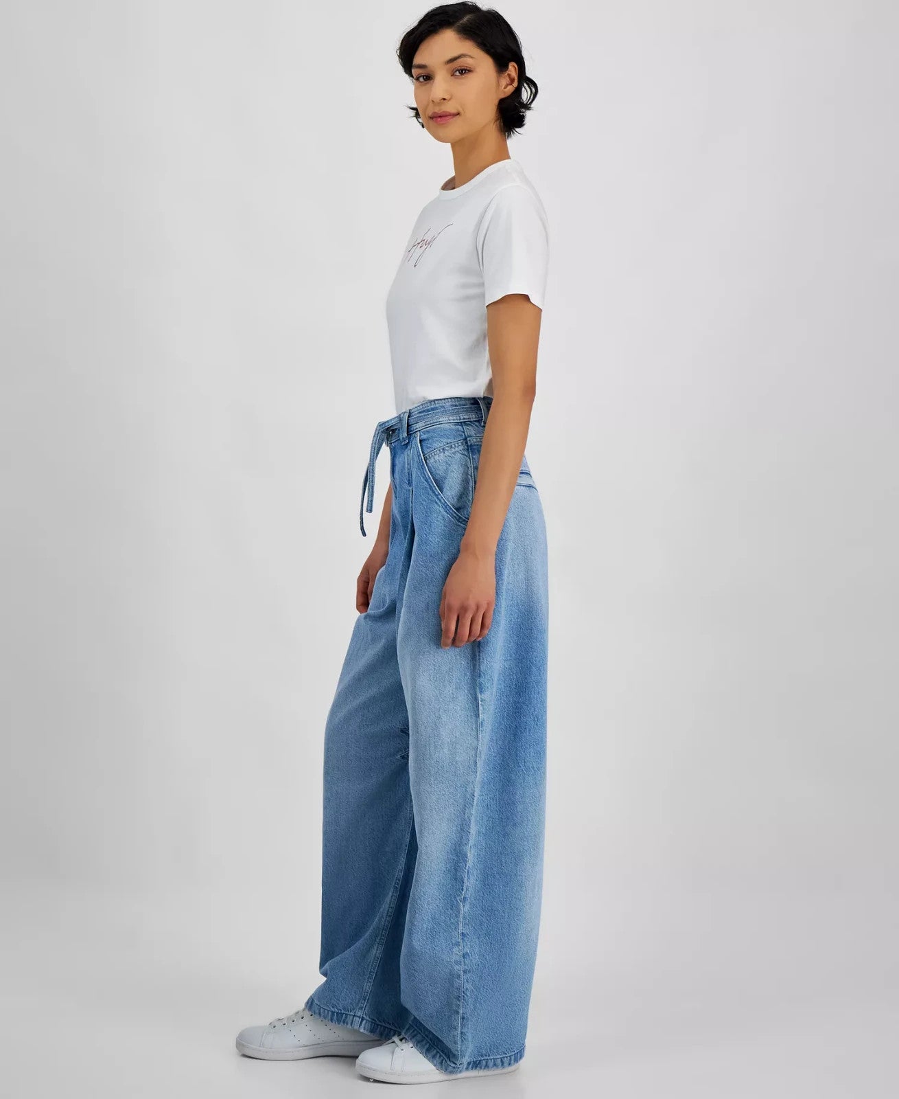 • Zipper and button closure; belt loops and tie denim belt