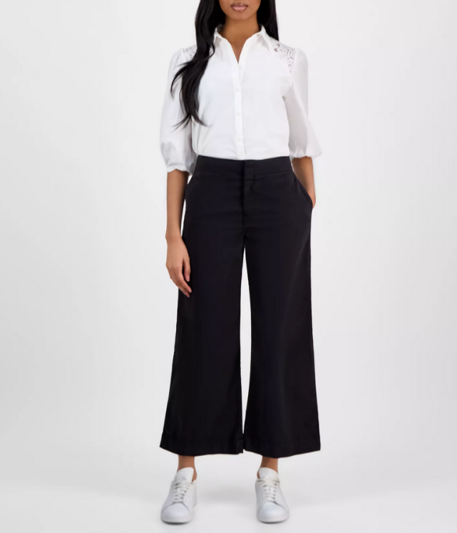 Zipper with hook closure at front; belt loops Side seam pockets at hips Inseam: 26" High Rise Cotton/elastane Machine wash cold Imported