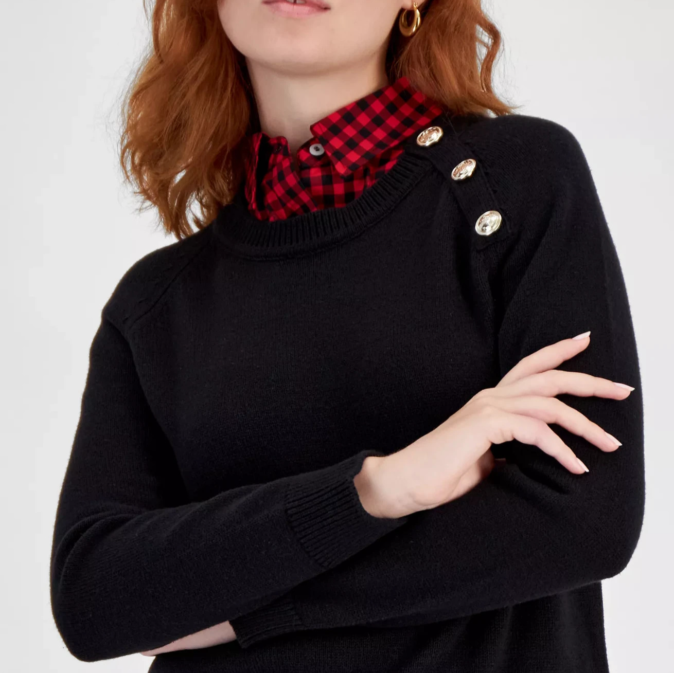• Plaid printed shirt; knit sweater; buttons at shoulder