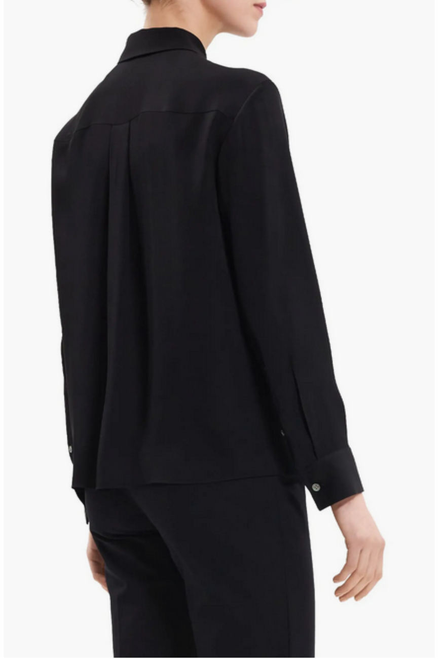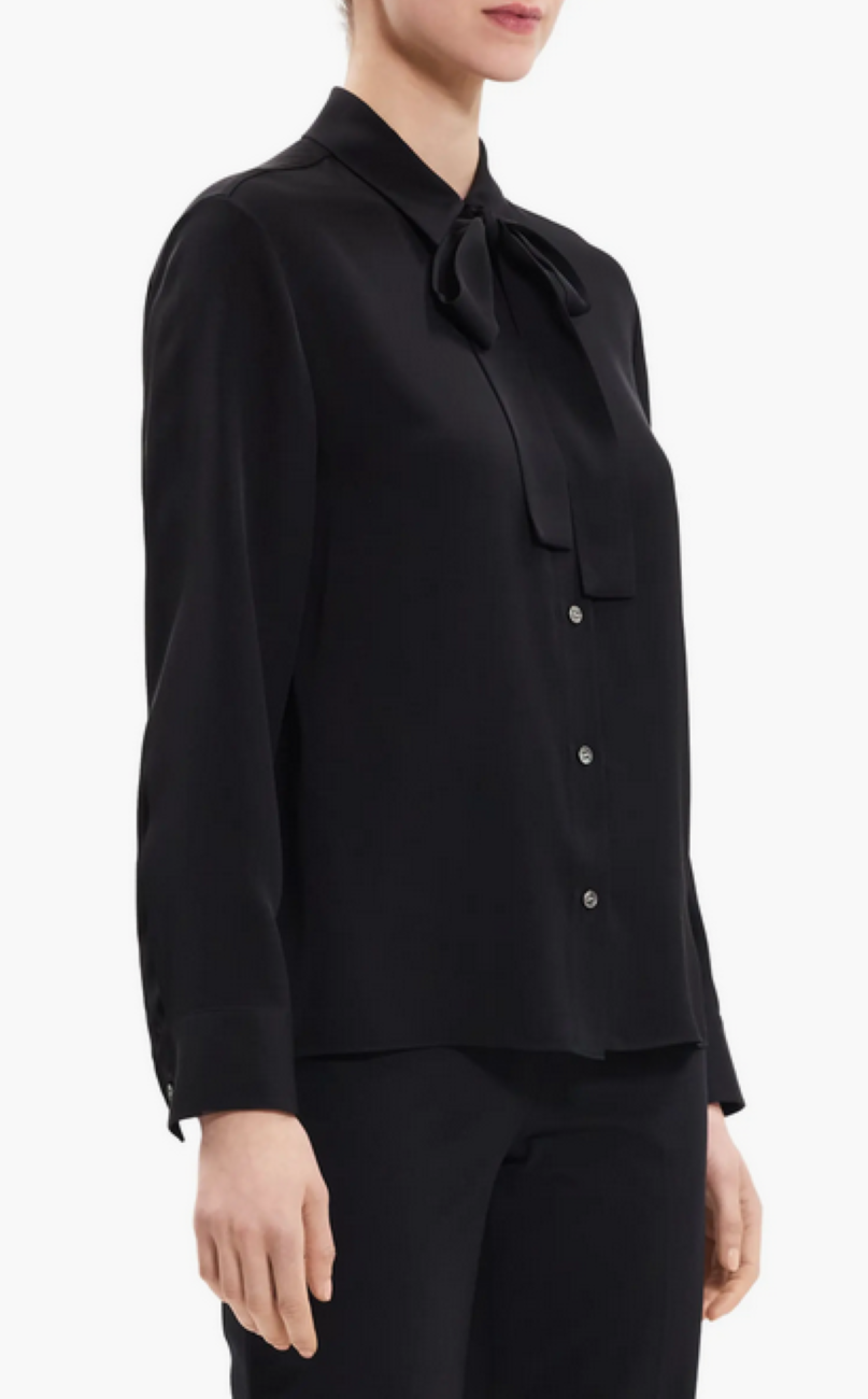 Point collar Attached self-tie neckline Long sleeves, button barrel cuffs Front button placket Box pleat at back yoke Designed for a slightly boxy fit 100% silk Dry clean Imported