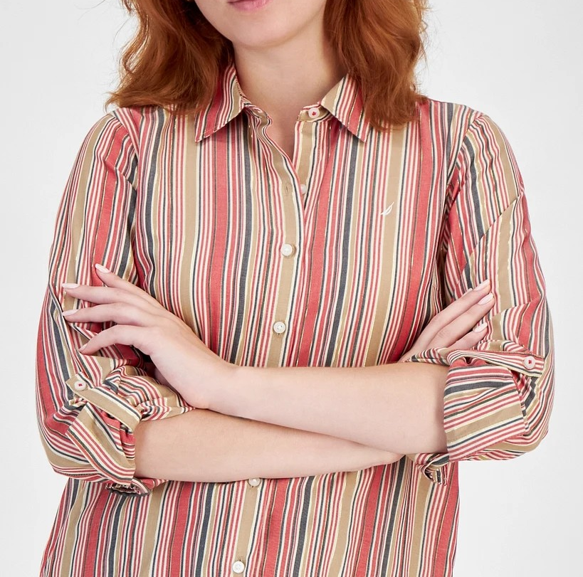 Nautica Jeans Women's Glint Stripe Roll-Tab Button-up Shirt MSRP $49.99