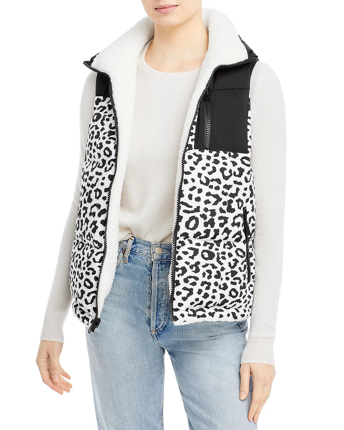 Faux fur exterior reverses to a leopard-print exterior with chest zip pocket