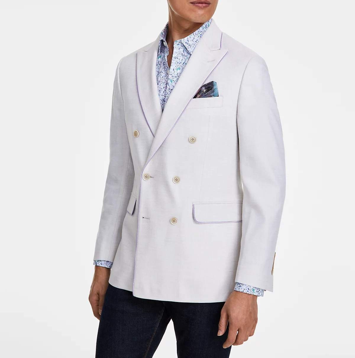 For an ultra-elegant, vintage-inspired look, suit up in this double-breasted sport coat from Tallia and tuck a color-rich pocket square into your welt pocket.