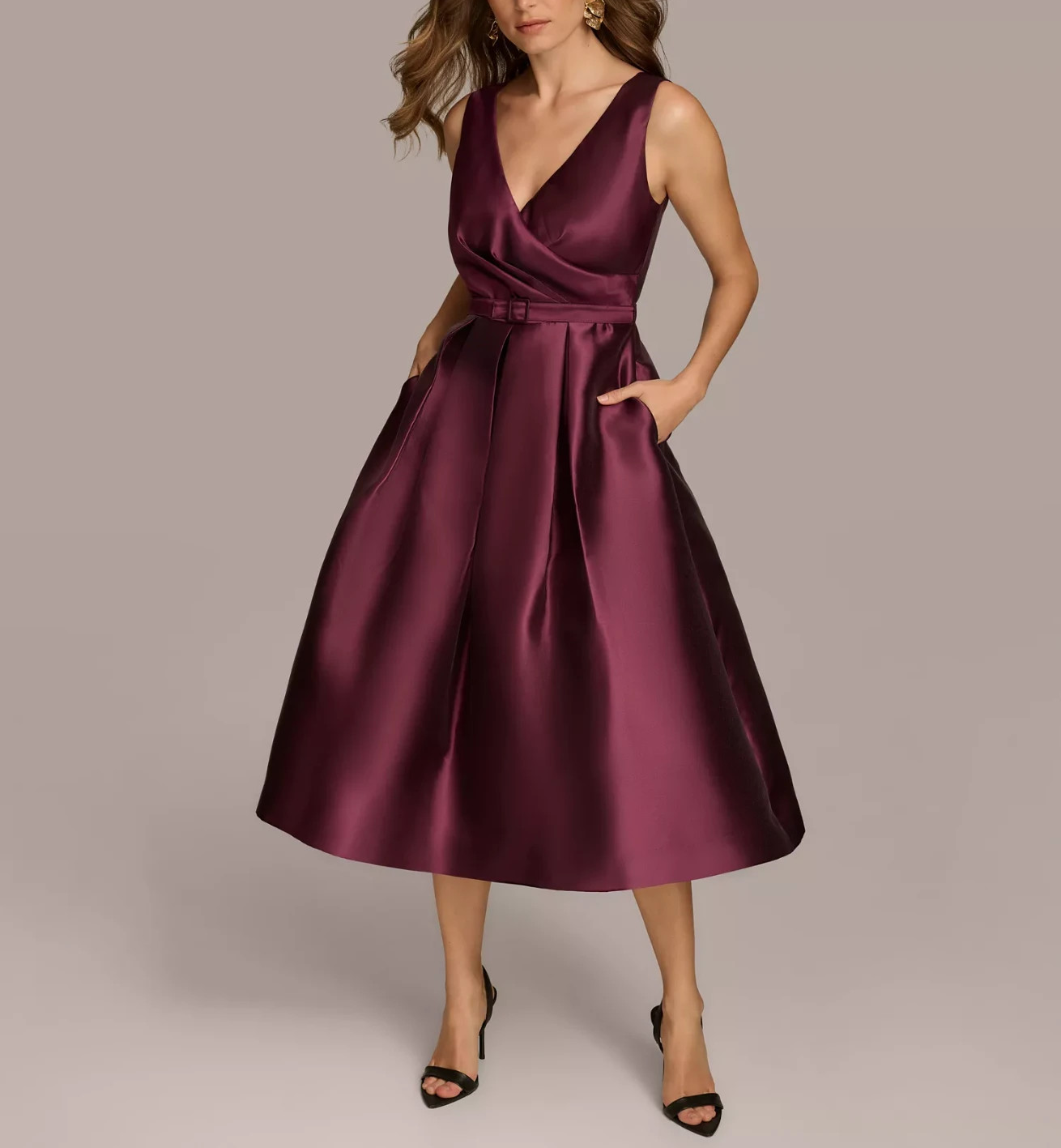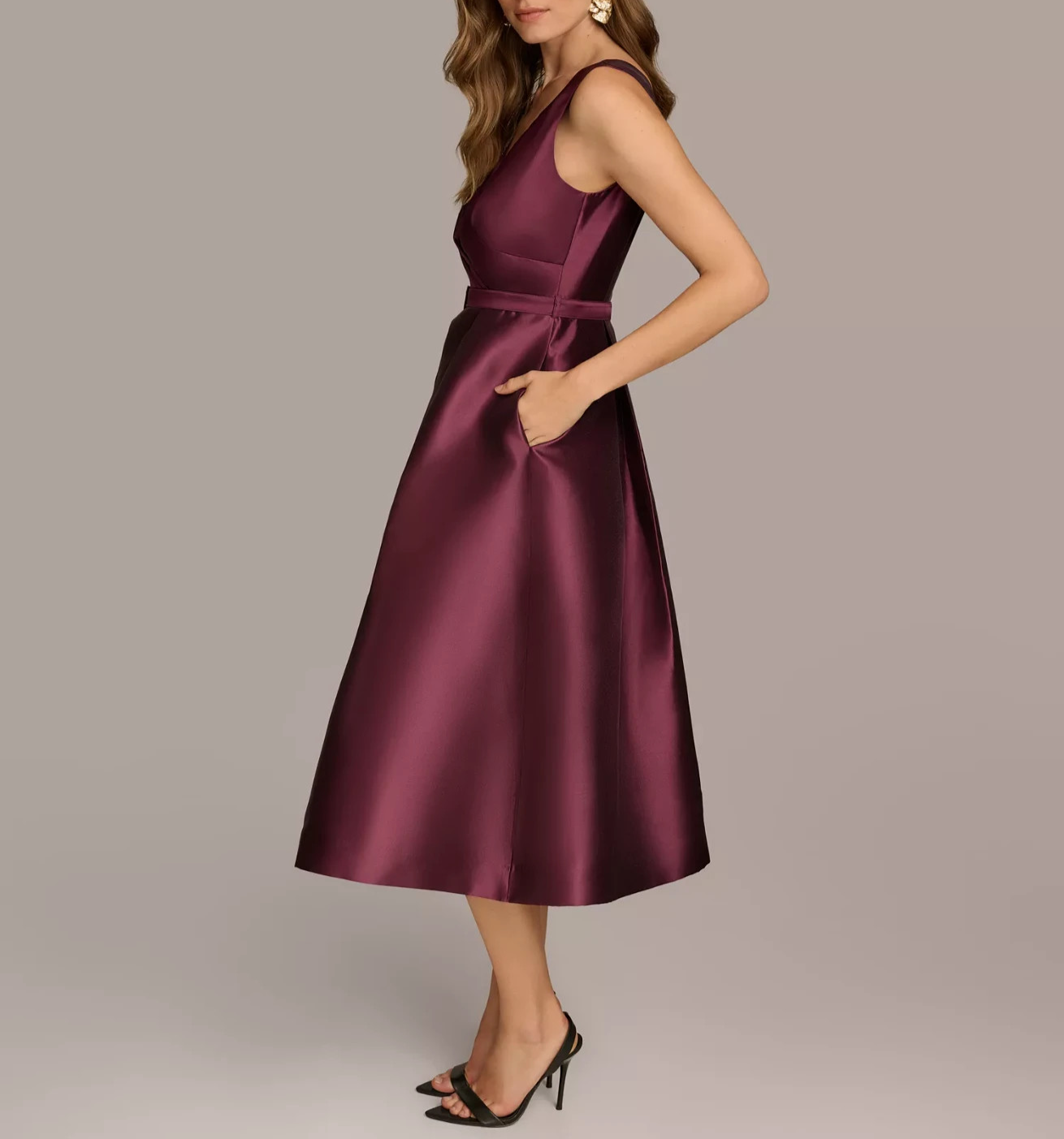 Sleek and sophisticated with a solid hue, Donna Karan's sleeveless midi dress features a belted fit and flare silhouette and handy pockets at the sides.